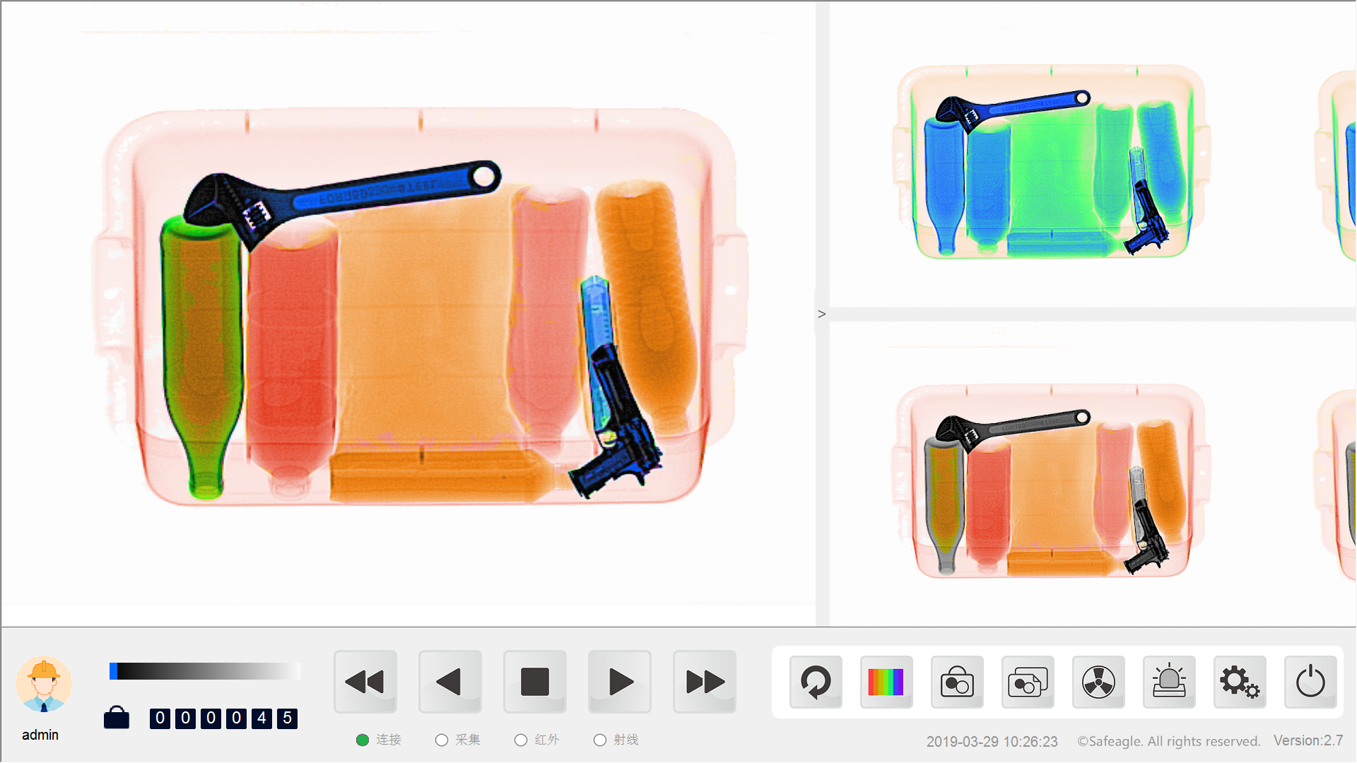 For the scanning image, we use red line selection the meterial can't penetrate, yellow line selection the explosive, green line selection the drug.